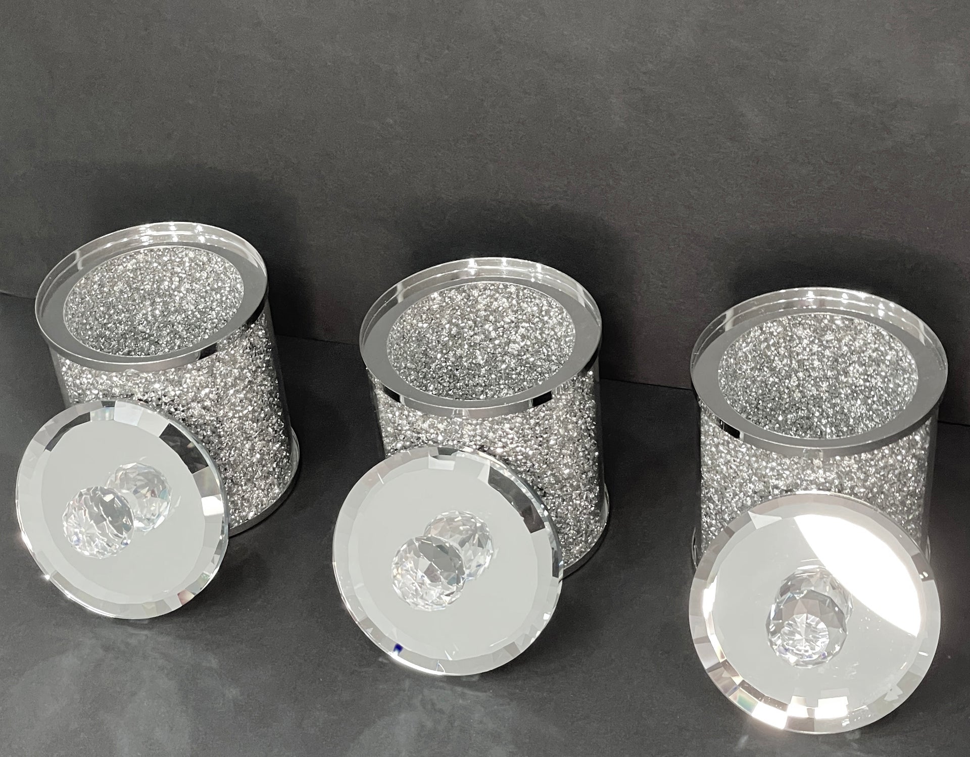 Exquisite three glass canister set in an elegant gift box. Features one size canisters in crushed diamond glass. Each glass lid includes a glass handle adornment and decorative chrome base. These beautiful accessories double as a functional piece and decorative accent bringing a modern touch to any home. Packaged in an elegant box, this is a perfect gift idea.