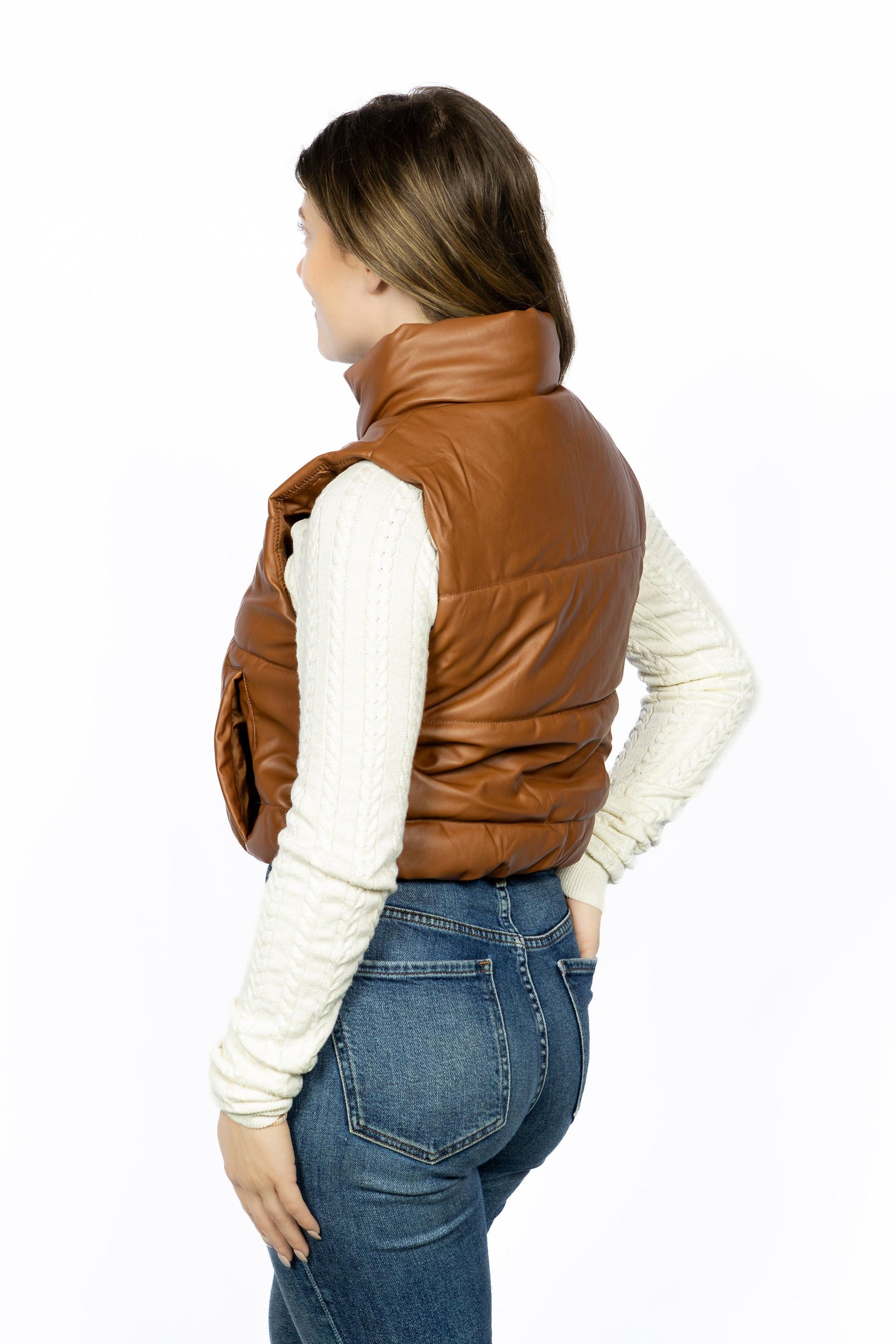 Introducing the Faux Leather Zip Up Puffer Vest, a piece from our Isabella Collection. This puffer vest is designed with a faux leather exterior, offering a chic twist on a classic fall staple. It's not just about looking good though, this vest is also about feeling good. The fully lined interior provides added warmth, making it an ideal choice for those crisp fall days.