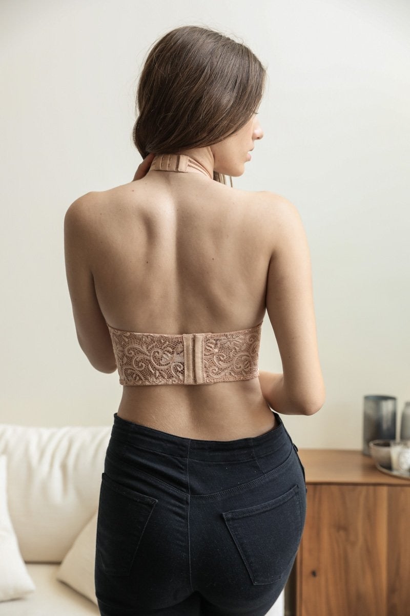 A sheer lace bralette with a mesh high neck and clasps on the neck and back that fastens to your perfect fit. #LoveMyLeto