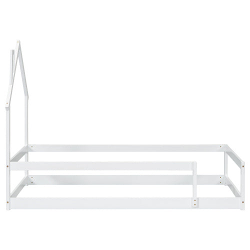 Twin Size Wood bed with House-shaped Headboard Floor bed with Fences,White