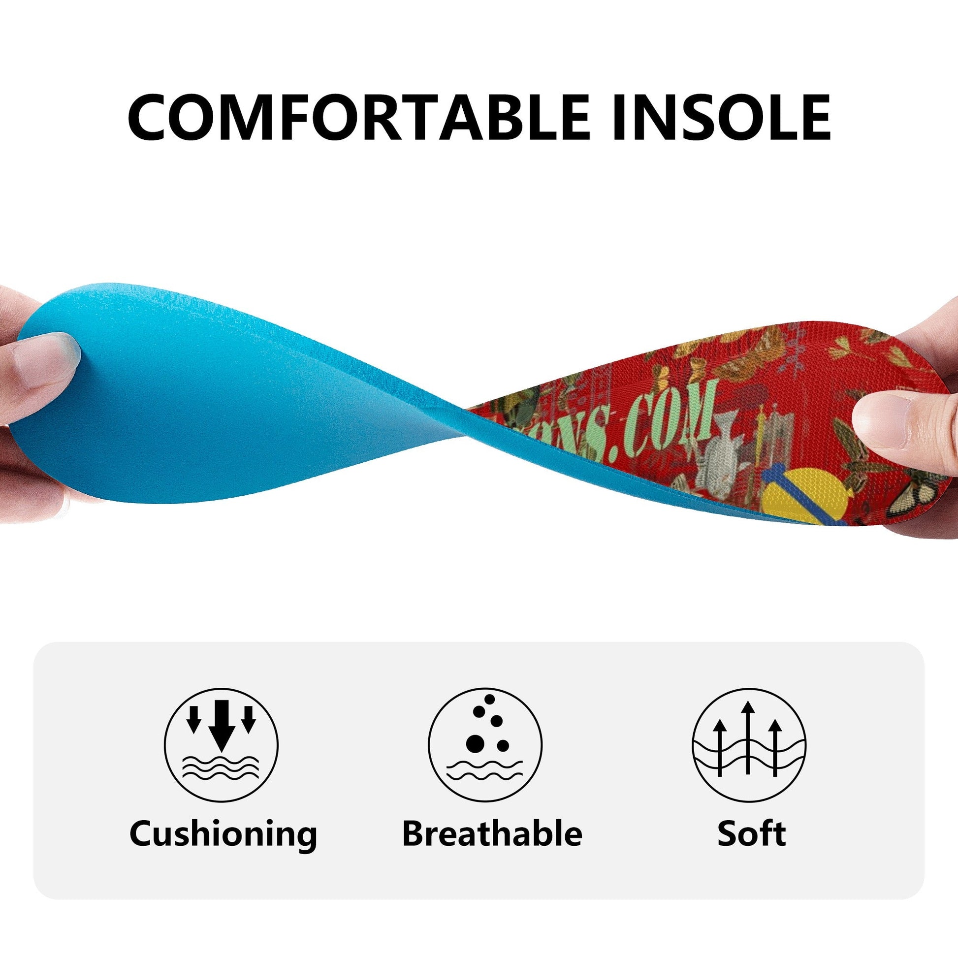 One of our coolest and relatively new products.  Super-comfortable due to form-fitting upper and the shock absorption of the air soles.  A number of designs available, each, featuring one of our colorful and vibrant collages.