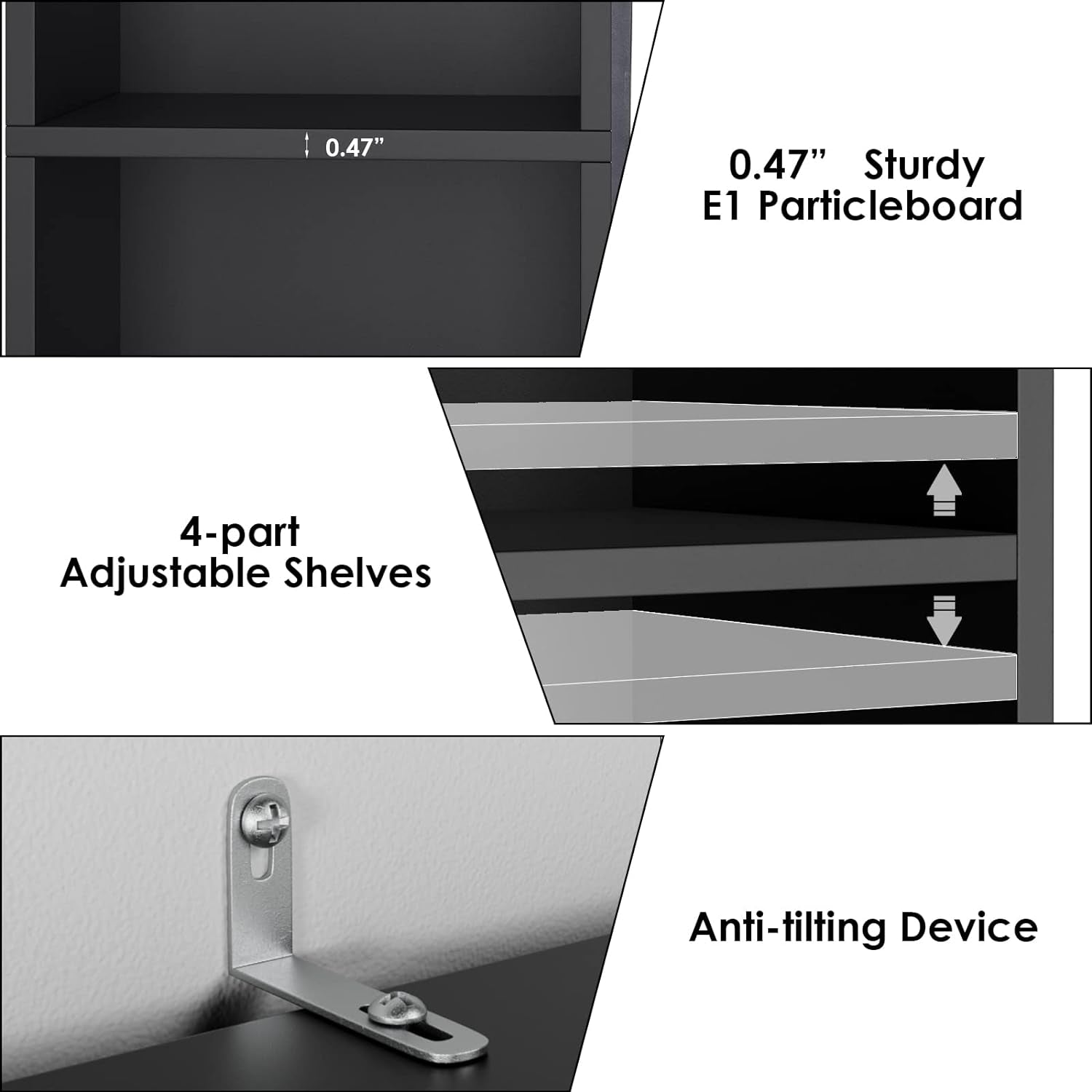 Comes with 4 adjustable shelves, each of them has 3 opsitions to choose. You can adjust the CD rack as your preference.
