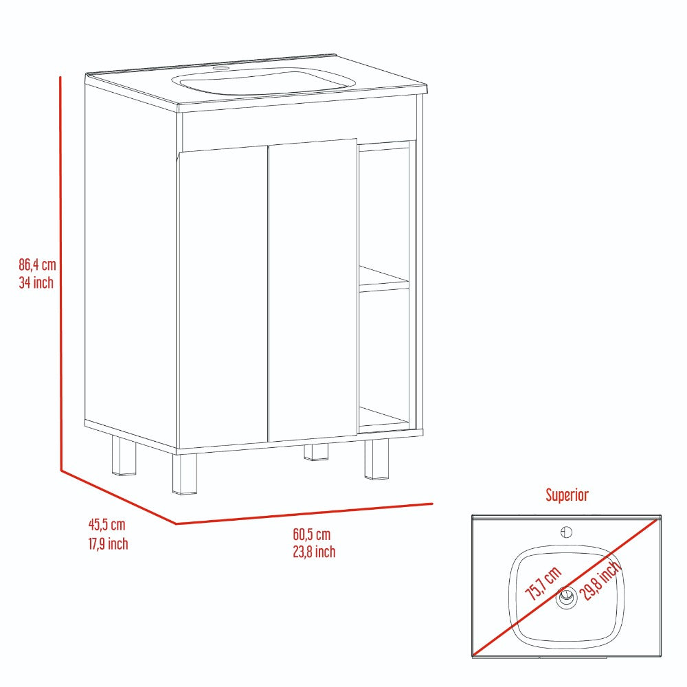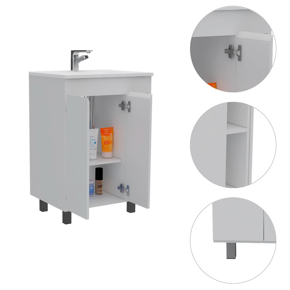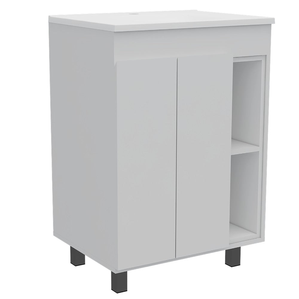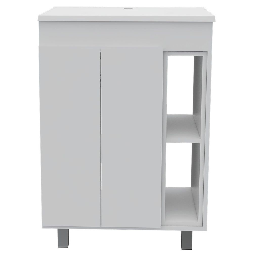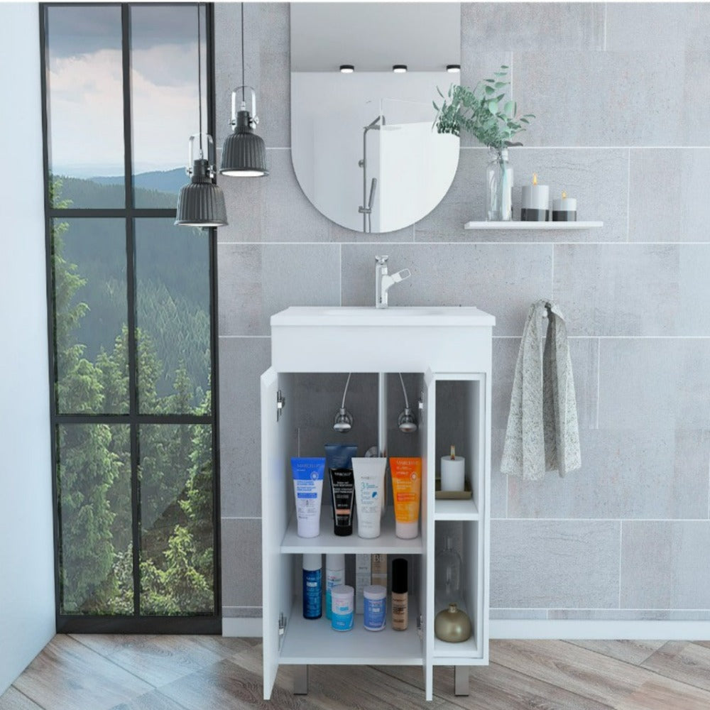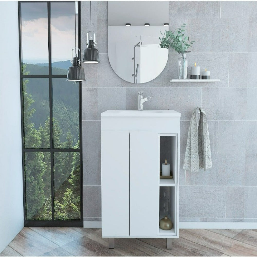 The Akron Vanity is an elegant piece that combines with its modern styling to renovate your bathroom and catch the attention of your guests. two external shelves, double door cabinet, free Standing, open cubby display space for décor and storage. Designed with elegant white manufactured wood.