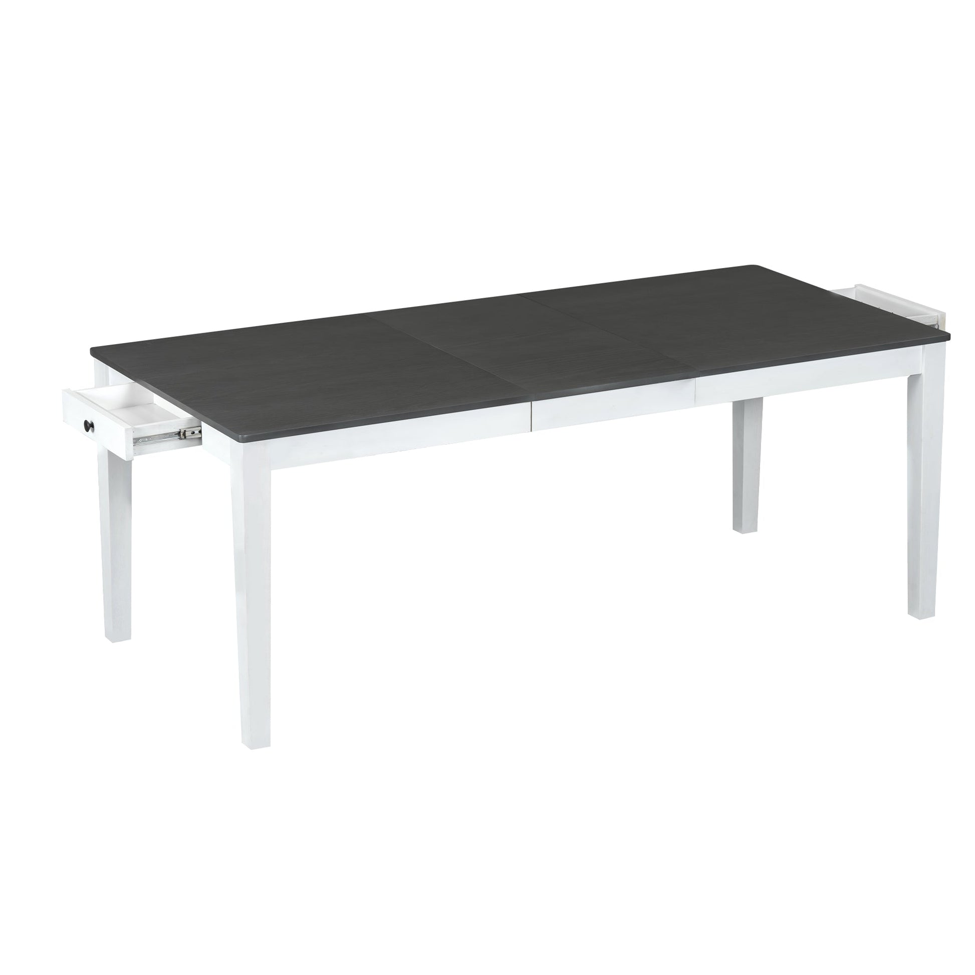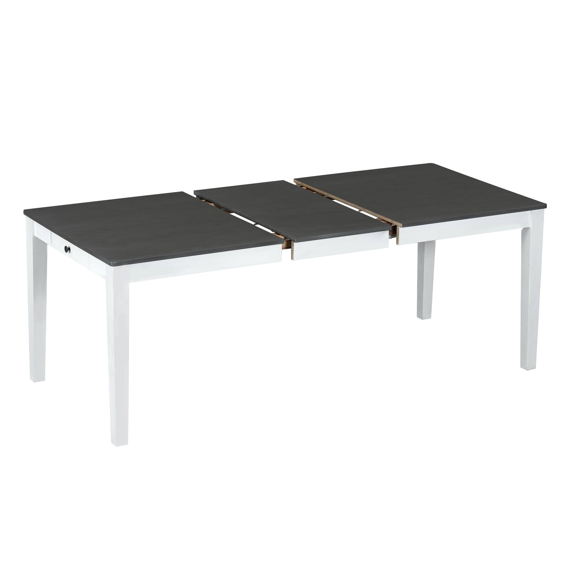 Solid Wood Frame // Rubber wood legs+Acacia wood Veneer Top // Tapered Table Legs // Extendable Tabletop // One 18” Removable Leaf // 6 Upholstered Dining Chairs // 2 Built-in Drawers // Wavy Back&Cushion Side // Ergonomic Back // Decorative Round Legs // 2 Colors Available // 3 Boxes In Total // 250lbs Weight Capacity for Each Chair //220lbs Weight Capacity for Table // Anti-Scratching Foot Pads for Table&Chair