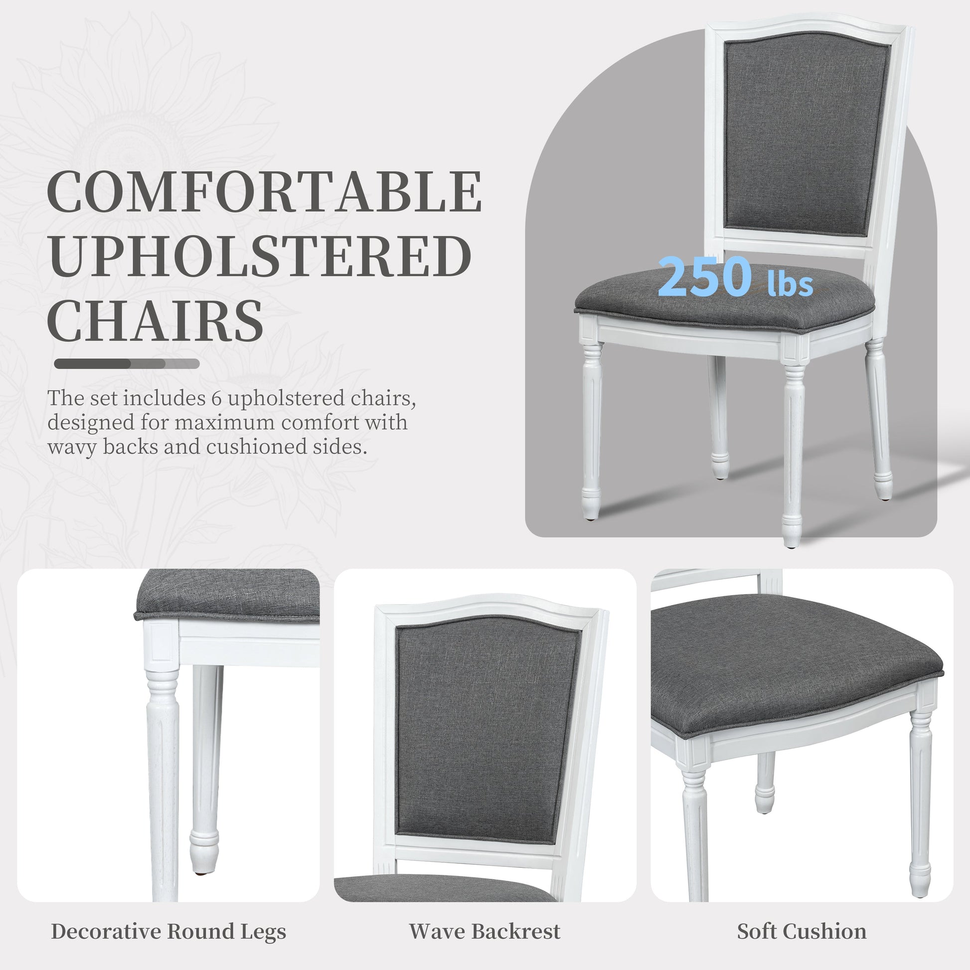 [Comfortable Upholstered Chairs] The set includes 6 upholstered chairs, designed for maximum comfort with wavy backs and cushioned sides. Ergonomically crafted to provide support, these chairs have a 250lbs weight capacity and make each meal more enjoyable, blending comfort and style in your dining room.