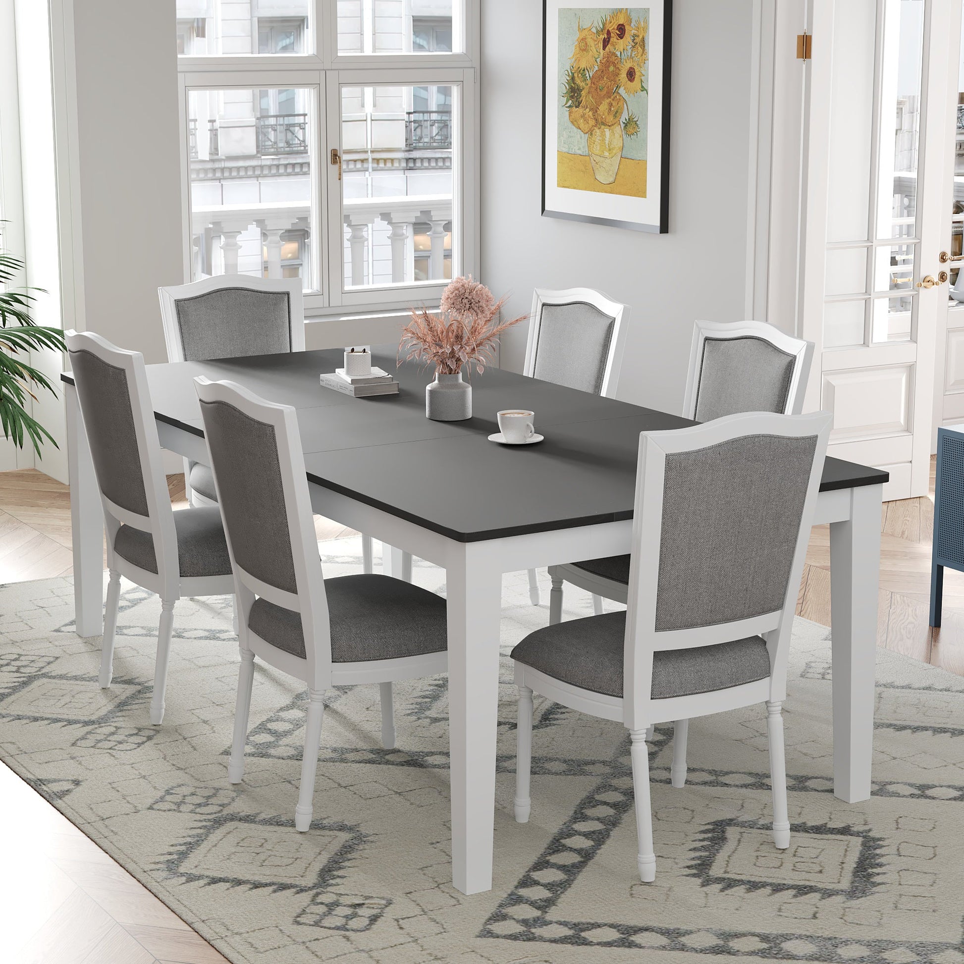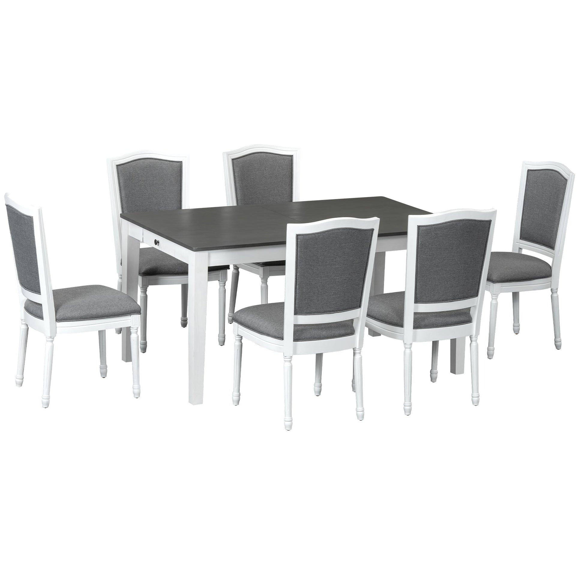 Enhance your dining space with this 7-piece solid wood dining set. The extendable tabletop with an 18' removable leaf accommodates family gatherings. 6 upholstered chairs feature ergonomic wavy backs and cushioned seats for comfort, supporting up to 250lbs each. The table includes 2 built-in drawers for added storage. With tapered, decorative round table&chair legs and anti-scratching foot pads, this set is both stylish and durable. Available in two colors, it’s easy to assemble and comes in three boxes. Weight capacity: table 220lbs, chairs 250lbs.