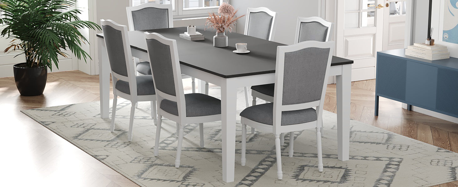 The set includes 6 upholstered chairs, designed for maximum comfort with wavy backs and cushioned sides. Ergonomically crafted to provide support, these chairs have a 250lbs weight capacity and make each meal more enjoyable, blending comfort and style in your dining room.