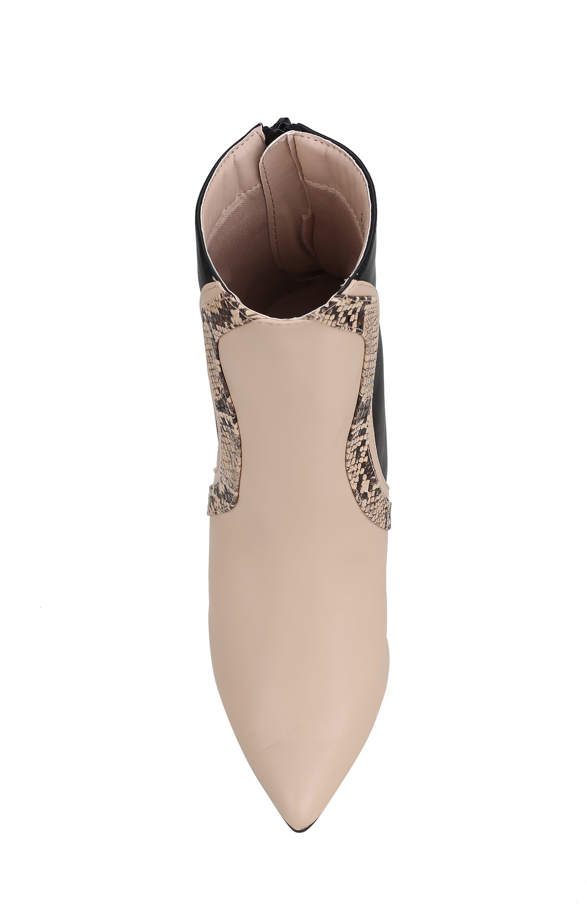 Get a luxe touch to your look with the Celeste Ankle Boot. This sophisticated ankle boot is crafted from a combination of smooth and elegant snake-embossed vegan leather in appointed-toe silhouette and set on a sleek stiletto heel. Wear them to add a sophisticated touch to your looks.