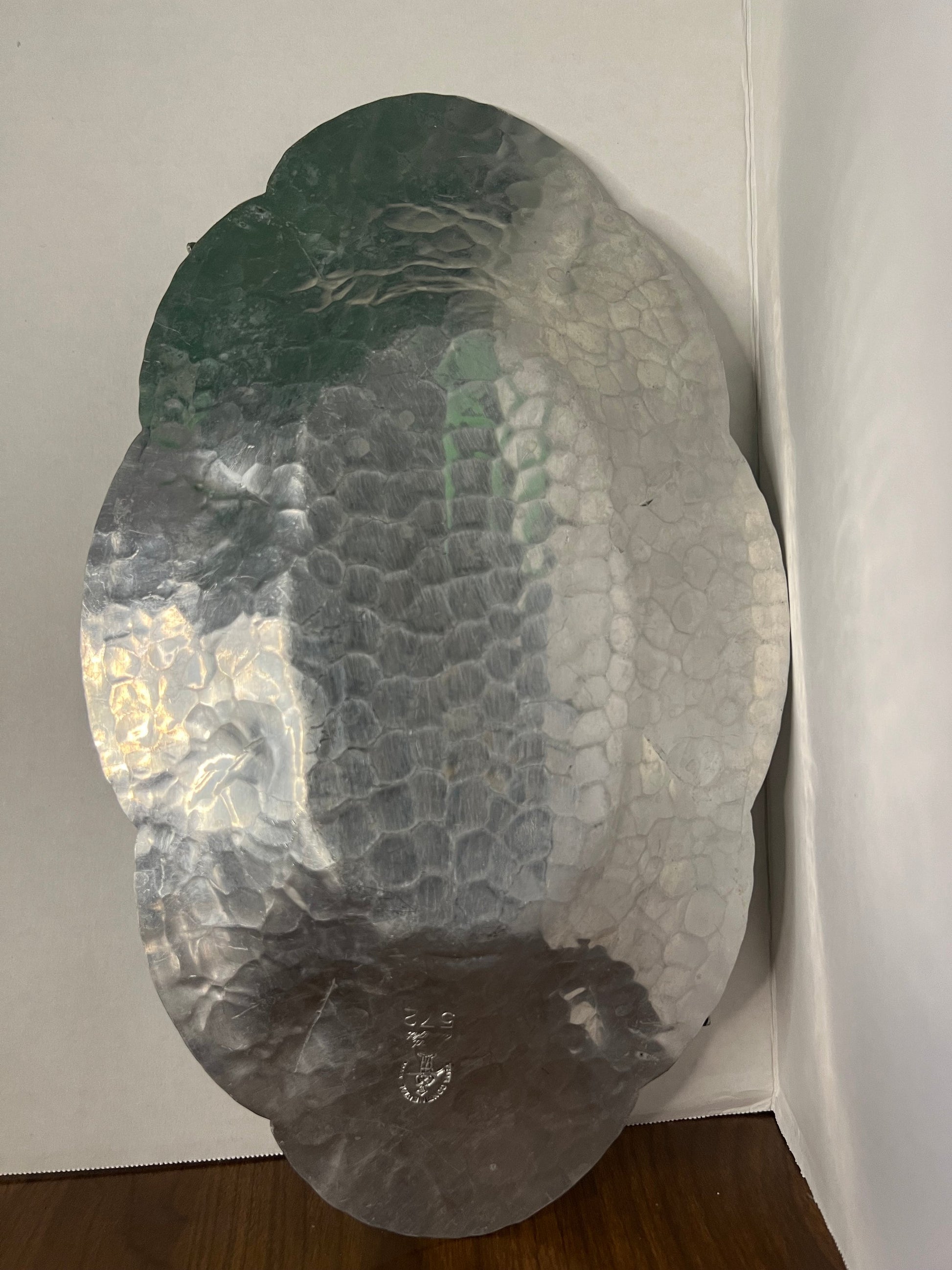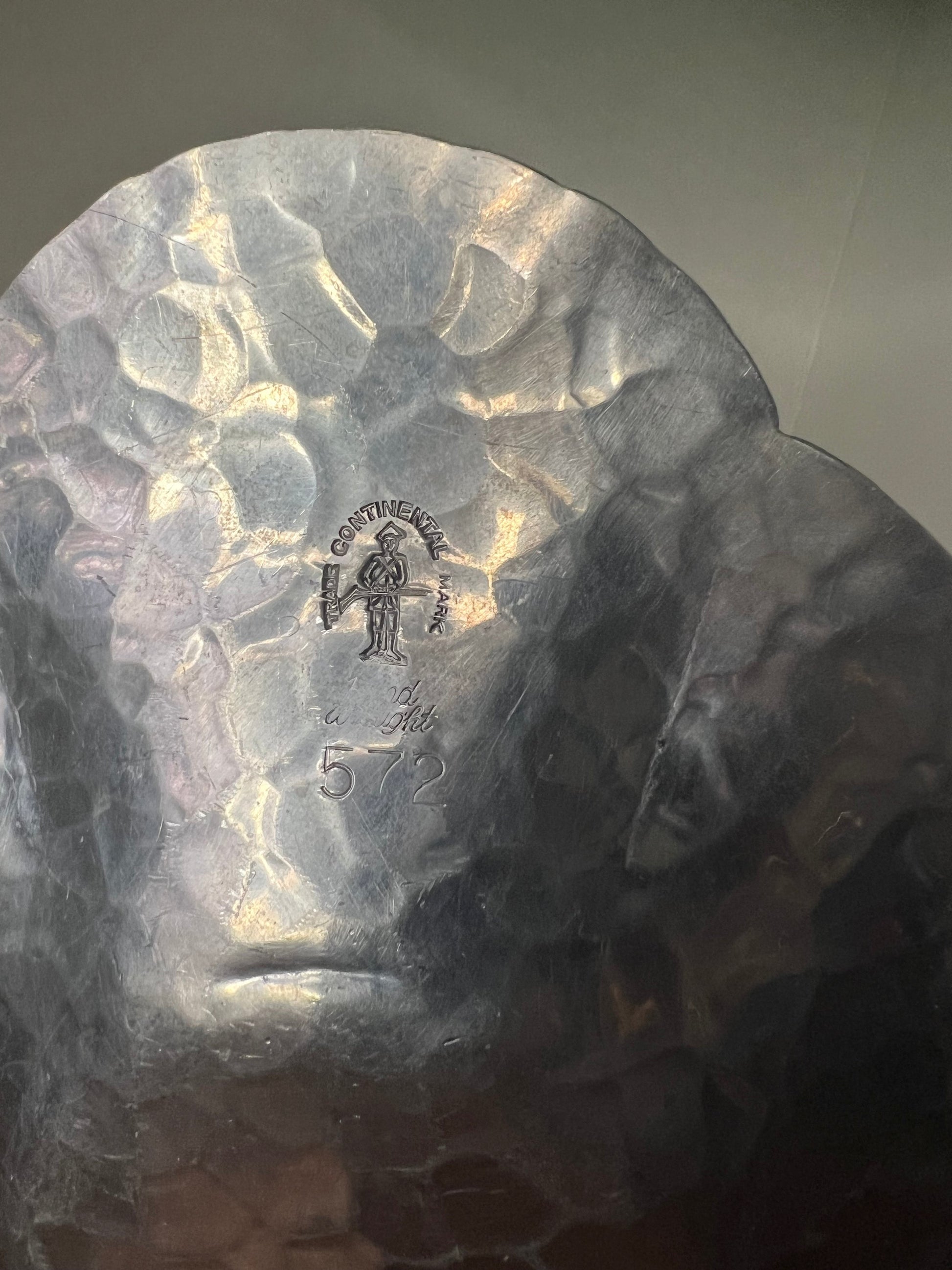 This exquisite Continental Hall Mark hand-wrought aluminum tray is a stunning example of vintage metalworking artistry. The intricate chrysanthemum design is hammered out by skilled artisans, creating a unique and beautiful piece. Made in the 1950s, this tray is a perfect addition to any collection of aluminum metalware or vintage collectibles. The brand, Trade Continental, is known for their high-quality products and this tray is no exception. Crafted from durable aluminum, this tray is both functional and decorative. Its unique design and handmade construction make it a one-of-a-kind piece. Whether you're a collector or simply looking for a beautiful aluminum tray, this Continental Hall Mark tray is sure to impress.