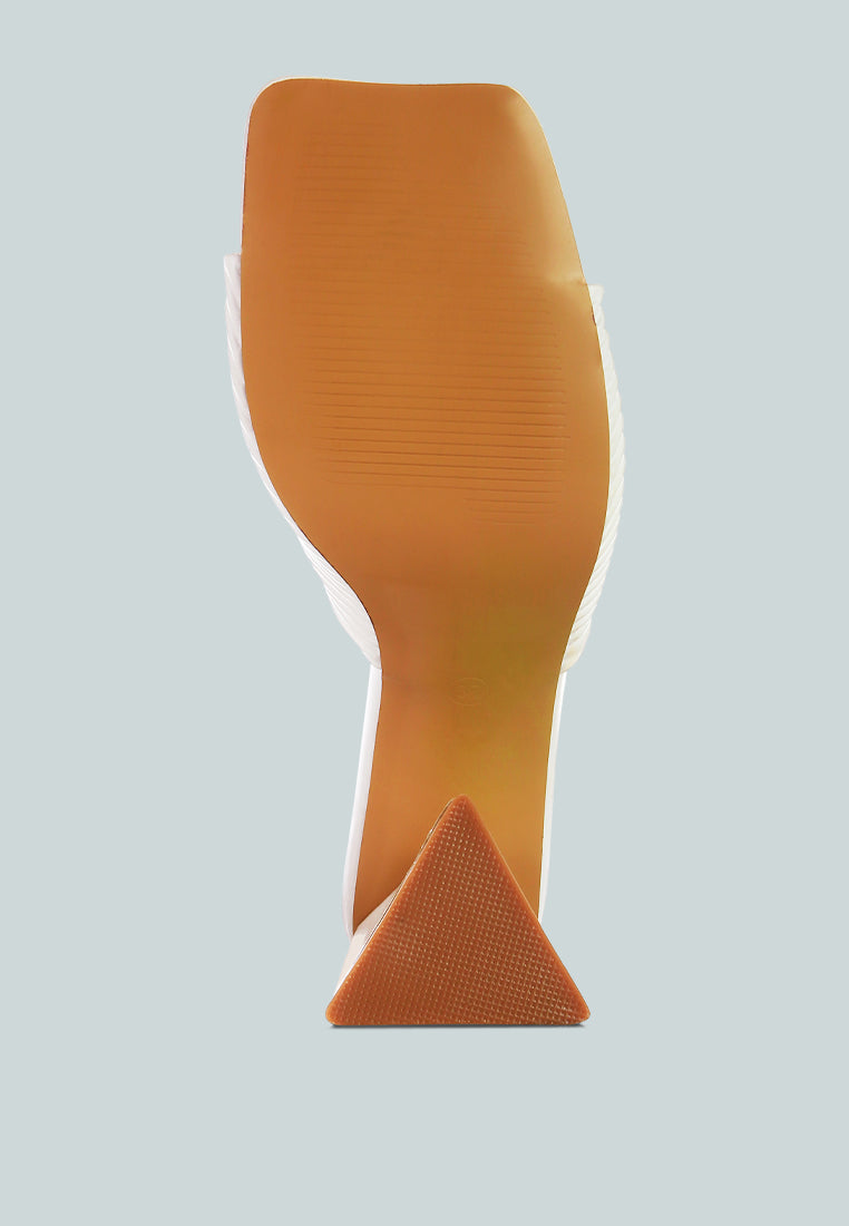 Triangular Block Heel Slider Sandals with heat set pleat pattern straps. The sandal has a softly padded insole which keeps feet relaxed. The high block heeled sandal is for everyday casual styling.