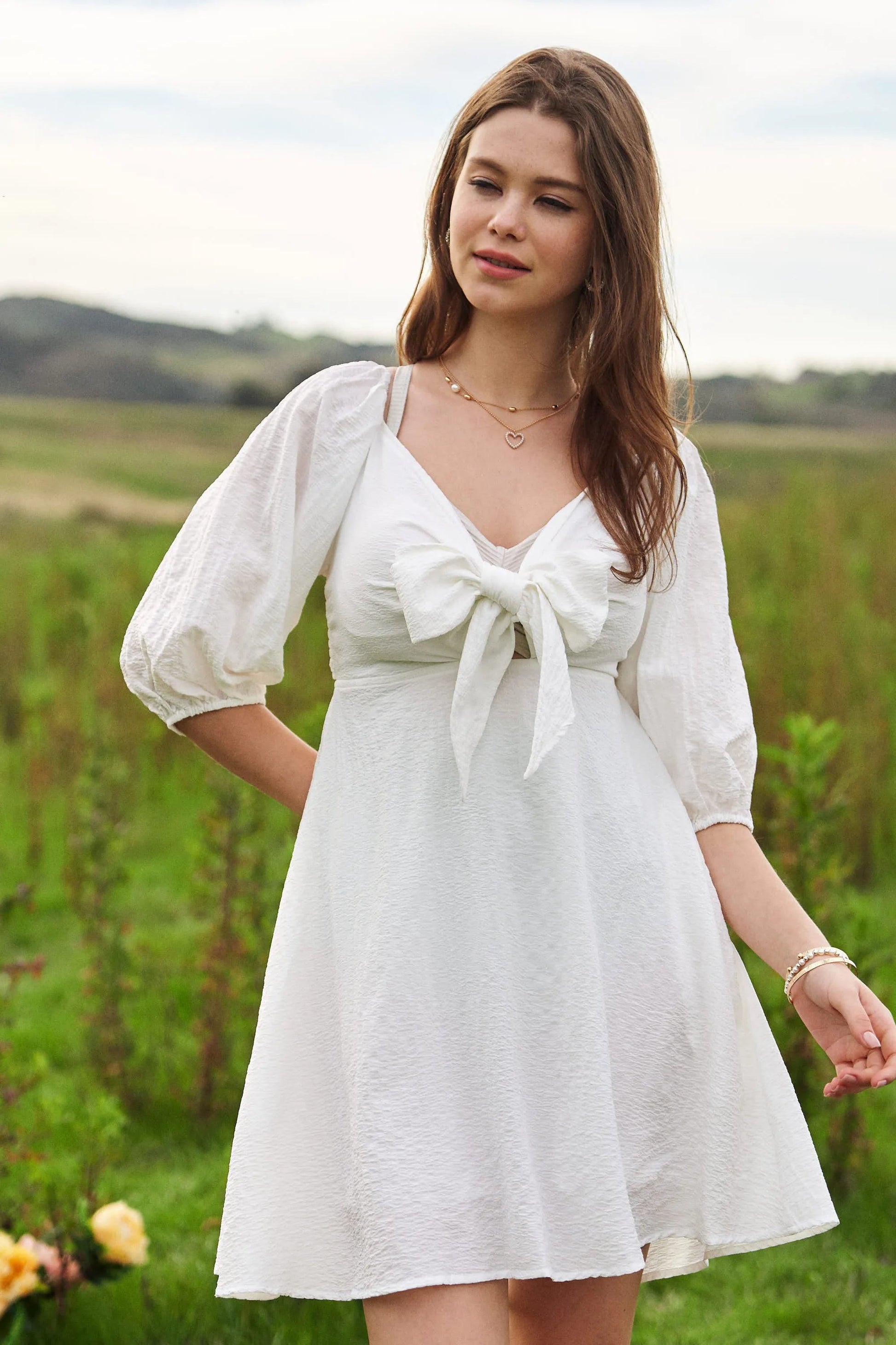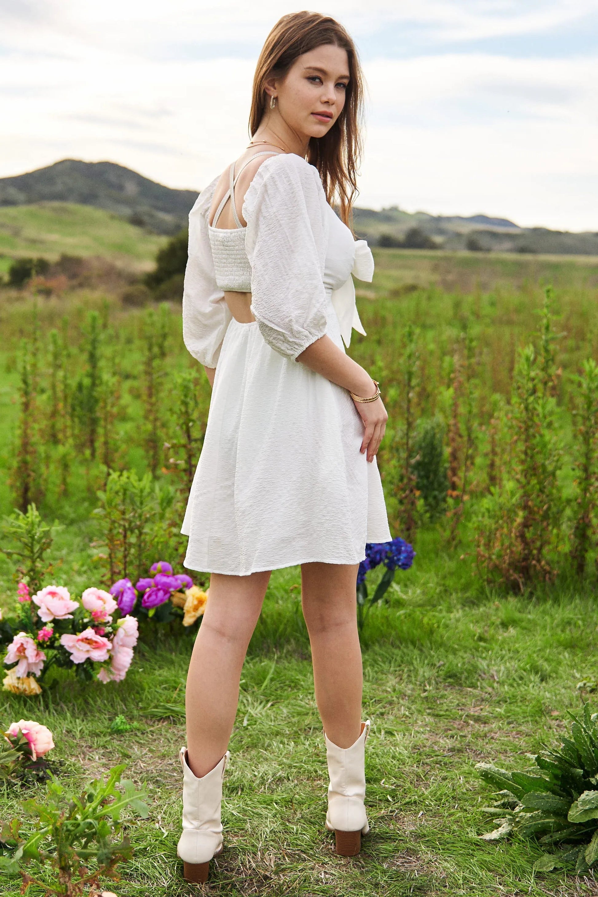 Davi & Dani Self-Tie Puff Sleeve Smocking Open Back Mini Dress