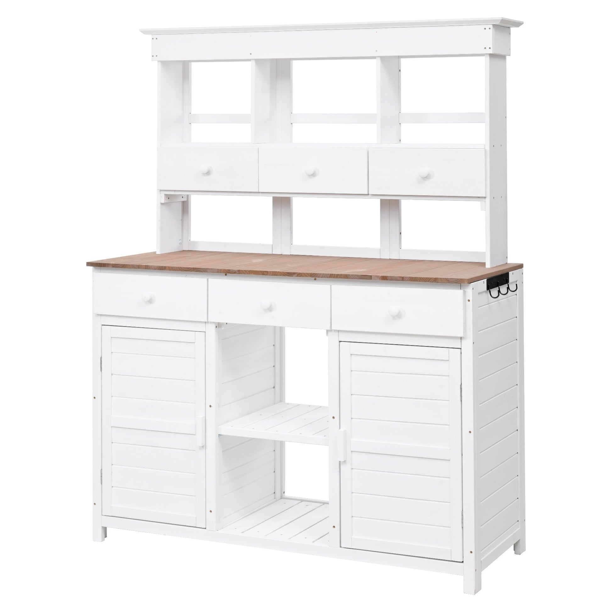 Fir Wood Frame //Ergonomic Counter Height Workstation // 6 Drawers // 2 Bottom Cabinets // 3 Adjustable 3-level Shelves // 2 Doors // 50x20.3inch Spacious Tabletop // 3 Side Hooks // Upper Hutch with Shelf for Vertical Storage // Suitable for Garden/Patio/Mudroom/Doorway/Greenhouse/Kitchen etc. // 3 Colors Available // 2 Ground Nails for Anti-tipping // Assembly Video Provided