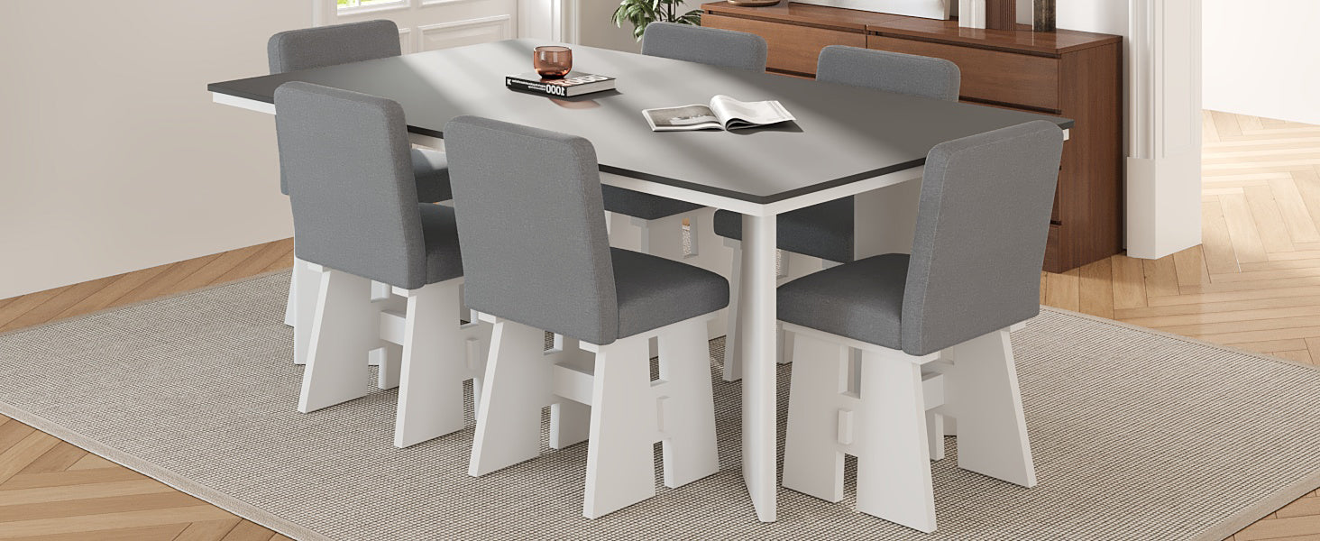 [Space-Saving Design with Tuck-Away Chairs] Ideal for smaller spaces or apartments, this dining set features a space-saving design that allows you to tuck the middle four chairs under the table when not in use. This clever feature reduces clutter, maximizing the available space in your dining area. Whether you're in need of more room for movement or simply want to keep the area neat, this design is both practical and stylish, giving you the flexibility to enjoy meals.