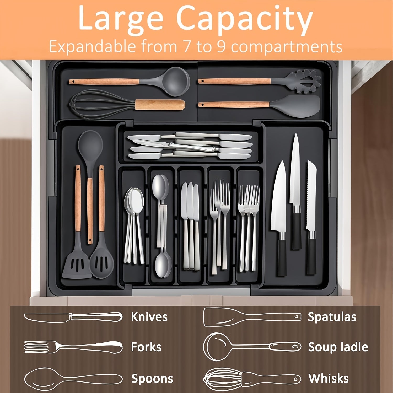 Bullet Points:[🍴 Customizable Storage] With 9 compartments and expandable features, this organizer tray offers the perfect space for all your cutlery, utensils, and kitchen gadgets.