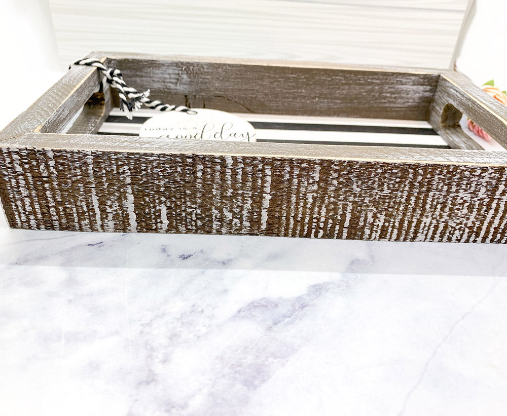 This black and white tray is an amazing neutral option! Also adds a daily reminder the be grateful every day and that "Today is a good day" which is written on one side and the back side of the black and white tray is blank/white.