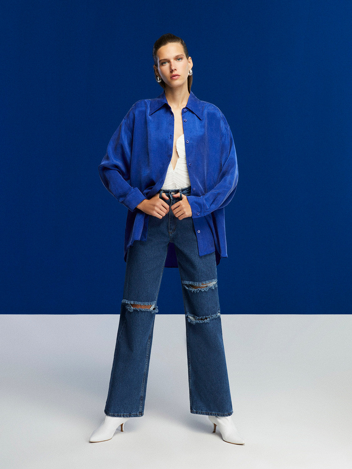 Wide leg jeans with front button and zip fly. Rip detailing. Side and back pockets.