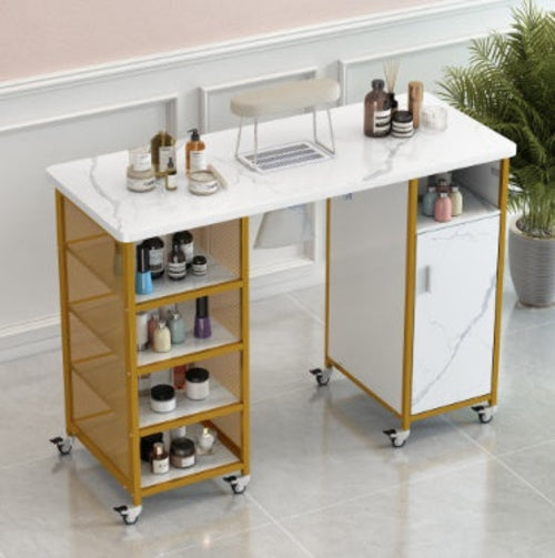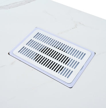 Product Name: Manicure Table, Marbling Texture Nail Table with Electric Downdraft Vent, Wrist Cushion, Lockable Wheels, Storage layers & cabinet, White