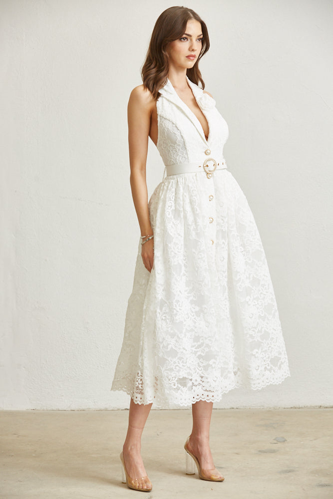 Turn heads in this elegant floral lace dress featuring a romantic halter neck collar and delicate rose accent trim. Designed with timeless charm and modern femininity, this dress showcases a pearl button front closure and includes a pearl 'O'-shaped metal buckle belt for a cinched, flattering silhouette.