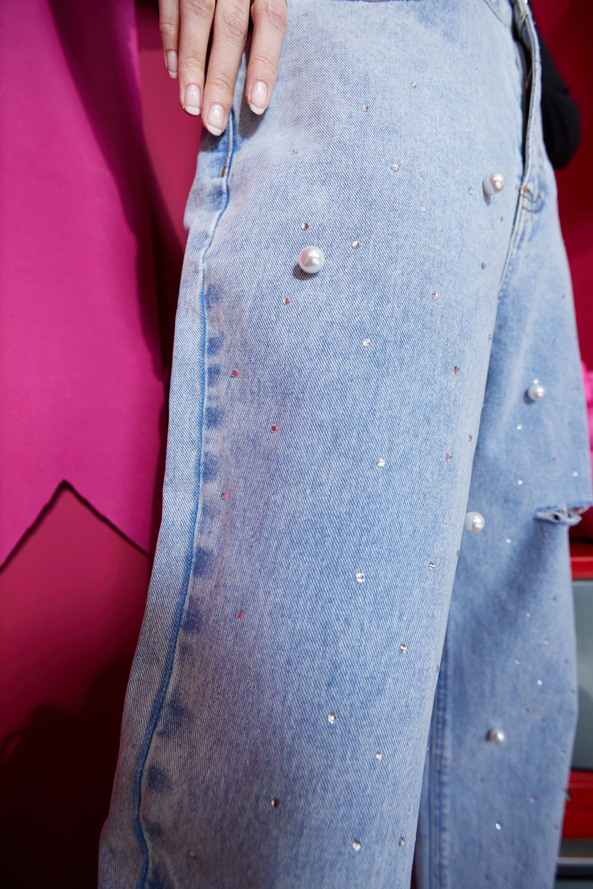 Solid High Waist Washed Casual Denim Jeans Woman,Spring ELF Pure Ripped Hole Diamond Beaded Ladies,Daily Trousers