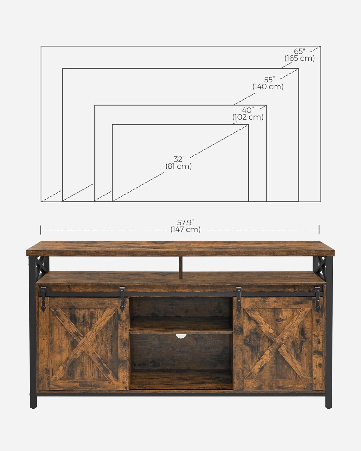 • Ample Storage: Enjoy 3 distinct storage options, including 2 adjustable shelves behind sliding barn doors, 2 open compartments with an adjustable shelf, and an open shelf, perfect for organizing games, movies, and media players.
