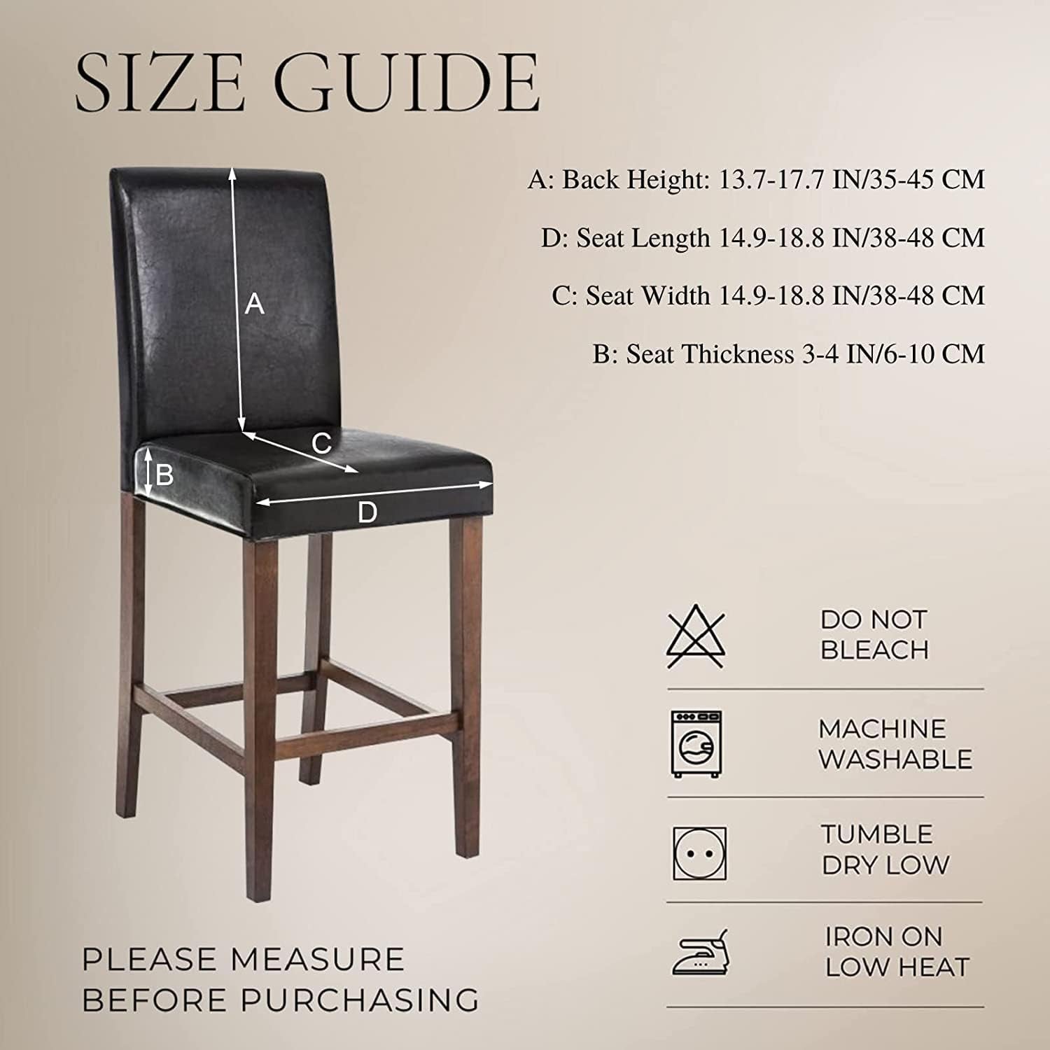 • Universal Fit: Designed to accommodate a wide range of chair sizes, these covers fit bar stool chairs with a back height of 17.3-18.7 inches and a seat length and width of 15.7-19.7 inches.